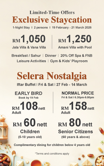 Experience an authentic, tranquil escape with our Mangala Experience Residential Package. Enjoy a relaxing 3-day, 2-night stay in your choice of Sara Villa, Vana Villa (without pool), or Amani Villa (with pool). Delight in RM300 Resort Credit to spend on food, beverages, and spa treatments.